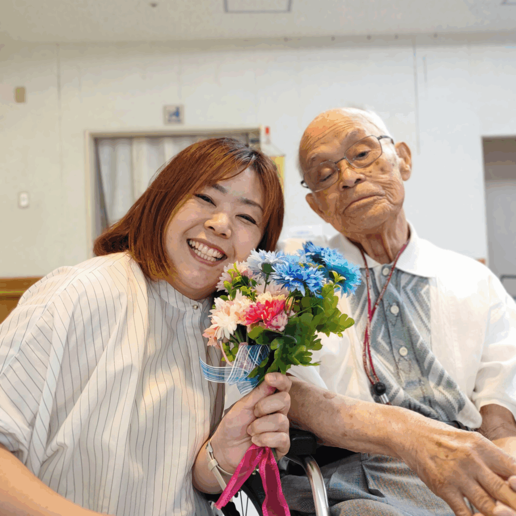 幼稚園に入園したばかりの子どもたちとの時間を大切にしたい──そんな思いで仕事を探していた時、四恩園デイサービスの求人に出会いました。介護の仕事は未経験でしたが、週2~3回、半日勤務も可能で柔軟に働けるパート勤務からスタート。一緒に働く先輩方や同僚の皆さん、お客様たちにも様々なことを教えて頂き、とても勉強になった日々で、思い返すと介護技術や知識の取得のみならず、人間的にも成長できたように感じます。
